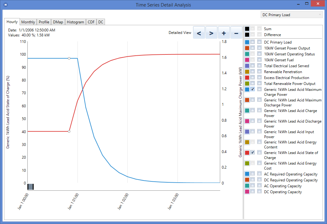 In the plot below, the maximum charge power (blue line) is 1.58 kW, as we calculated. This is for a 1 kWh battery, 10 minute time steps, and a 3 C maximum charge rate: