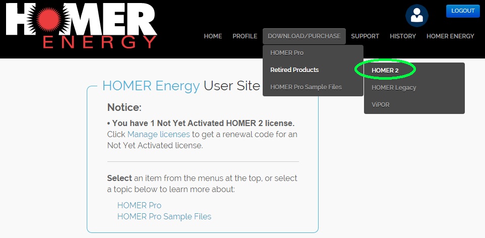 Step 1 - Sign in to your HOMER account at users.homerenergy.com, and you will be taken to the home page. Go to the HOMER 2 product page by clicking the HOMER 2 link on the left side of the page. Note: If you do not have a user account, please refer to Knowledgebase Article 10495 for instructions for creating a new user account.
