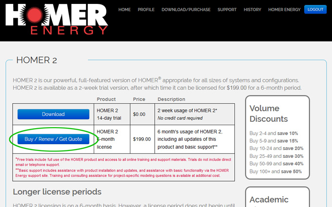 Step 2 - On the HOMER 2 product page, click the Buy/Renew/Get Quote button to go to the Order page.