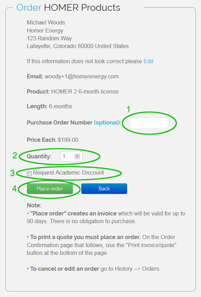 Step 3 - On the Order HOMER Products page: (1) Enter your company's optional purchase order number, if any; (2) Enter the quantity; (3) If you are affiliated with an educational institution, you may request an Academic Discount which requires that you provide proof of your academic association (Steps for providing proof of academic affiliation will be covered in a future Knowledgebase article); (4) Click the Place order button.