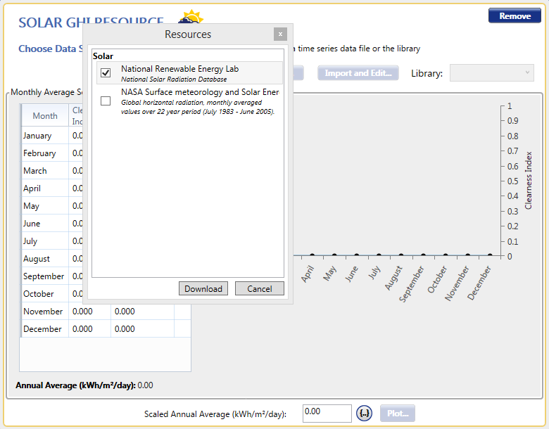 Then, go to the appropriate resource page, in the resources tab. You can download data for solar GHI for solar PV panels, wind for wind turbines, or temperature data for considering temperature effects on PV or wind turbines. Click the button "Download from Internet".