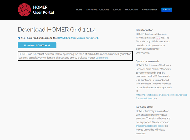 If you sign in using the “Log in” button, go to DOWNLOAD/PURCHASE > HOMER Grid > Download to reach the download page. Read and agree to the “HOMER End User Agreement” and click the “Download HOMER Grid” button to begin downloading the latest version of HOMER Grid.