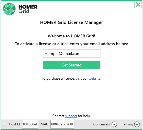 It will ask for your email address when you open HOMER Grid for the first time. Click on the "Get Started” button, and this will automatically download the license file through HOMER Grid.