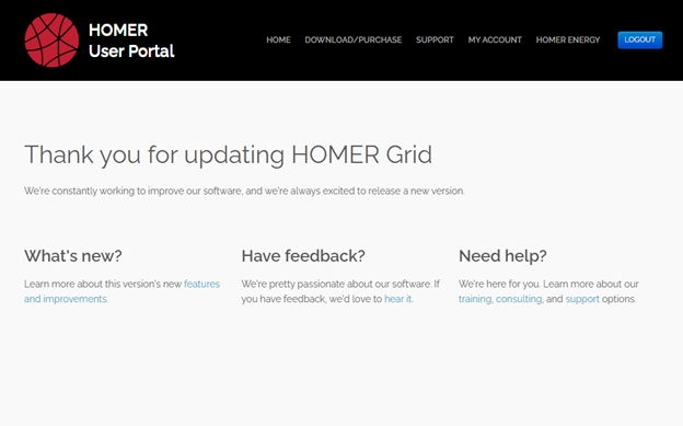 If you log in through the “Register Now & Get Your Free Trial” tab, you will be directed to the HOMER Quick Links page, then click HOMER Grid to get to the download page. [OR: “If you log in by clicking the “Try It Free” button, you will be directed to the download page”]