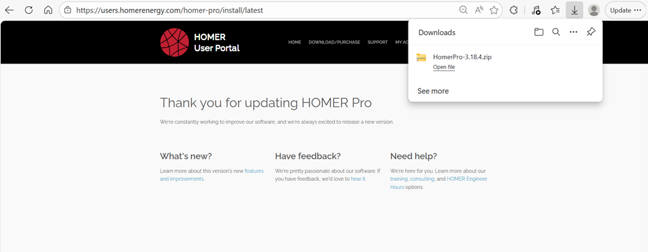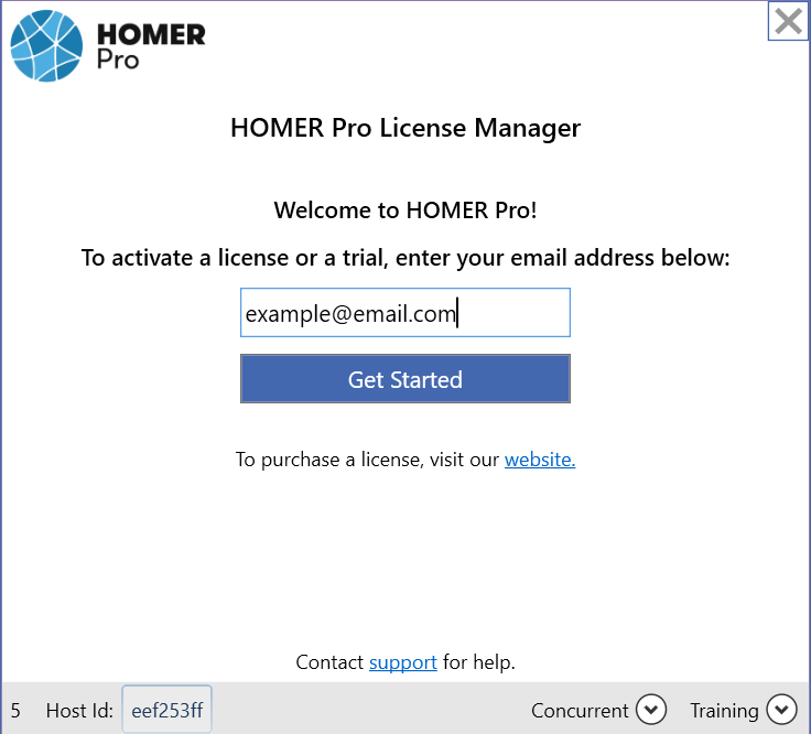 Product: All versions of HOMER Pro This article describes how to Download, Install, and License HOMER Pro. Download To download HOMER Pro, you first must log in or create an account. You can accomplish this by clicking on the “Log In" tab on the top right of the HOMER Software Home Page or by clicking one of the several links around the website. If you are a new user and creating an account for the first time, please go through the user registration process and confirm your email address. Before you can download HOMER Pro, you will be asked to complete your user profile with further questions. Please answer the questions to the best of your ability to help us understand our users and their needs. Once you have completed your profile, you will be directed to the HOMER Pro download page. If you log in through the “Register Now & Get Your Free Trial” tab, you will be directed to the HOMER Quick Links page, then click HOMER Pro to get to the download page. [OR: “If you log in by clicking the “Try It Free” button, you will be directed to the download page”] If you sign in using the “Log in” button, go to DOWNLOAD/PURCHASE > HOMER Pro > Download to reach the download page. Read and agree to the “HOMER End User Agreement” and click the “Download HOMER Pro” button to begin downloading the latest version of HOMER Pro. Install Once the software has downloaded, open the .zip file, and then install file named “HomerPro-x.x.x.msi” in your Downloads folder or located on the bottom of your browser to begin the installation process. The HOMER Pro Setup Wizard will guide you through the process. Licensing First-time HOMER Pro users are eligible to try out our software for free for 7 days. The trial will include all modules and will be fully functional. If your work requires creating a report, please explore our full license options. It will ask for your email address when you open HOMER Pro for the first time. Click on the "Get Started” button, and this will automatically download the license file through HOMER Pro. If you have already purchased a HOMER Pro License, click "Get Started" to retrieve your license. If you have purchased more than one license, you will be directed to our website to select the license you would like to activate. After you have activated your license, return to HOMER Pro to begin your design. Please contact support@homerenergy.com for any issues.