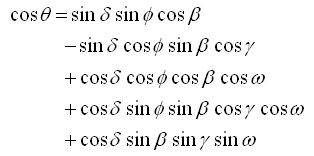 An incidence angle of particular importance, which we will need shortly, is the zenith angle, meaning the angle between a vertical line and the line to the sun. The zenith angle is zero when the sun is directly overhead, and 90° when the sun is at the horizon. Because a horizontal surface has a slope of zero, we can find an equation for the zenith angle by setting Β = 0° in the above equation, which yields: