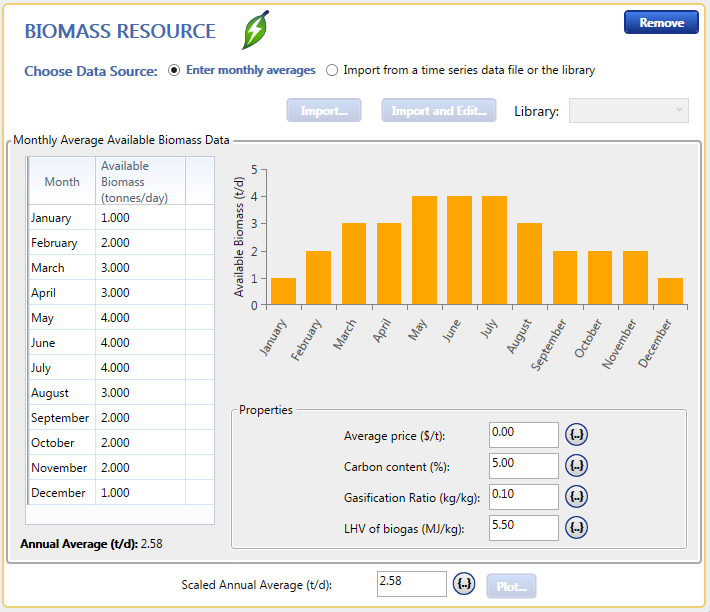 You can specify the availablility and cost of the biomass feedstock in the Biomass Resource menu. Since raw biomass generally can't be used in a generator, it is first converted to biogas through a process called gasification. The parameters of this process can be specified here. The biogas can be burned in a biogas or cofired generator like any other fuel.