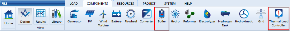 The Combined Heat and Power module adds two thermal loads, the thermal load controller, the boiler component, and the heat recovery ratio parameter in the generator menu.