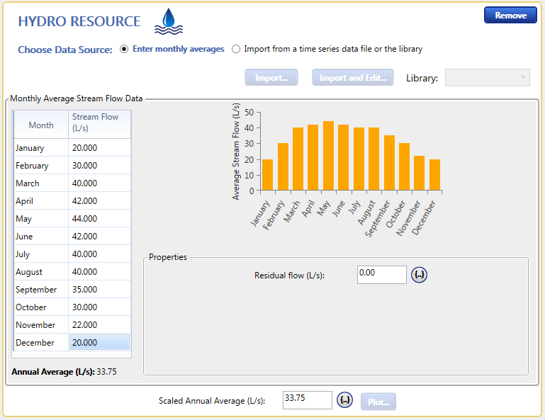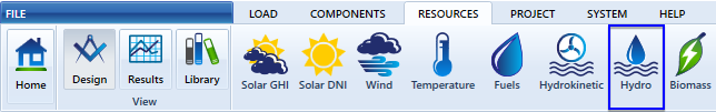 The Hydro module adds the hydro resource and the hydro component. You can specify the stream flow in the Hydro resource, either as twelve monthly values, or as an imported time series. The Hydro module is ideal for users who model systems that include conventional, small, or micro hydroelecticity generation.