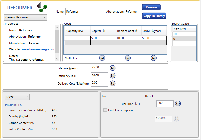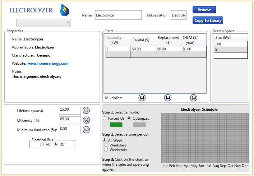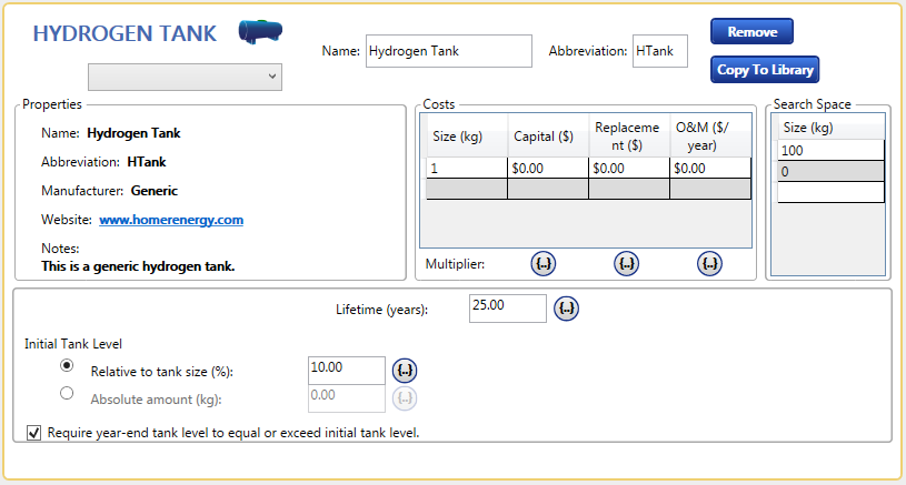 The Hydrogen module allows you to model systems that generate, store, and consume hydrogen. It is ideal for users who model fuel cells, remote off-grid operations, large industrial processes, or any system with hydrogen production, storage, or consumption. This module adds a reformer, electrolyzer, and hydrogen tank componenets. It also adds a hydrogen load and stored hydrogen fueled generator.