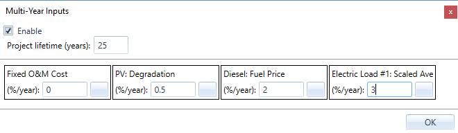 The Multi-Year module allows you to model changes that can occur over the course of a project. PV degradation, grid price escalation, load growth, and fuel price escalation are a few of the model parameters that you can include in a HOMER model with the Multi-Year module.